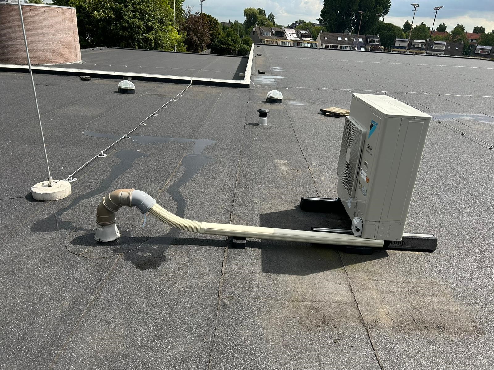 We vervingen het oude systeem door een nieuwe, energiezuinige airco-installatie, inclusief 5 jaar garantie. De openliggende leidingen werkten we netjes weg in kunststof goten, beschermd tegen weer én nieuwsgierige vogels. Ook plaatsten we de installatie op rubberen dempers in plaats van harde kunststof balken. Dat levert minder trillingen en dus een stillere werking op.